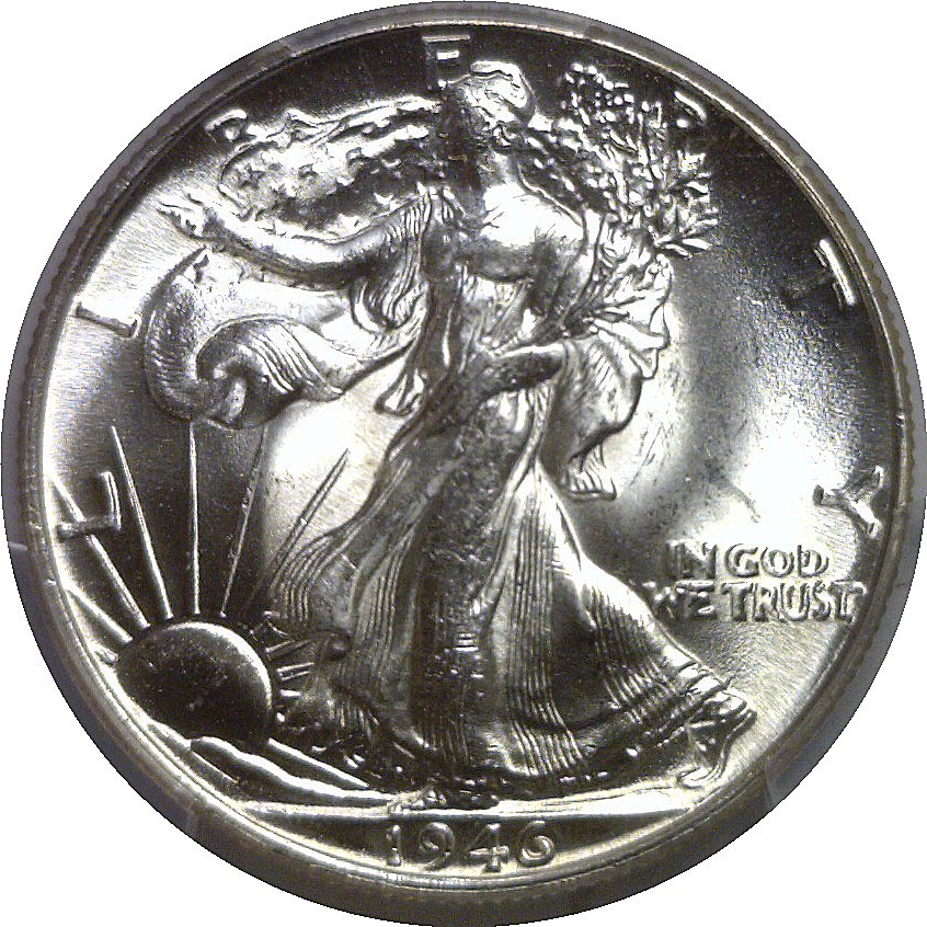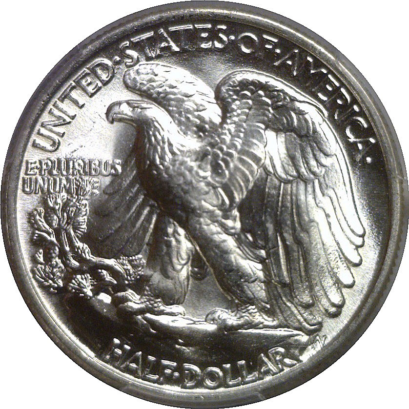 Doubled Die Reverse. The most obvious die doubling in the series and the only doubled die ‘Walker’ listed in the Redbook. E PLURIBUS UNUM and the eagle wing feathers show strong doubling. This is an outstanding coin for the grade with intense blast white luster and a very sharp strike. Contact marks define the grade, but they are minor and easily within the tolerance for an MS-64. The intense flashy luster gives this coin fantastic eye appeal!