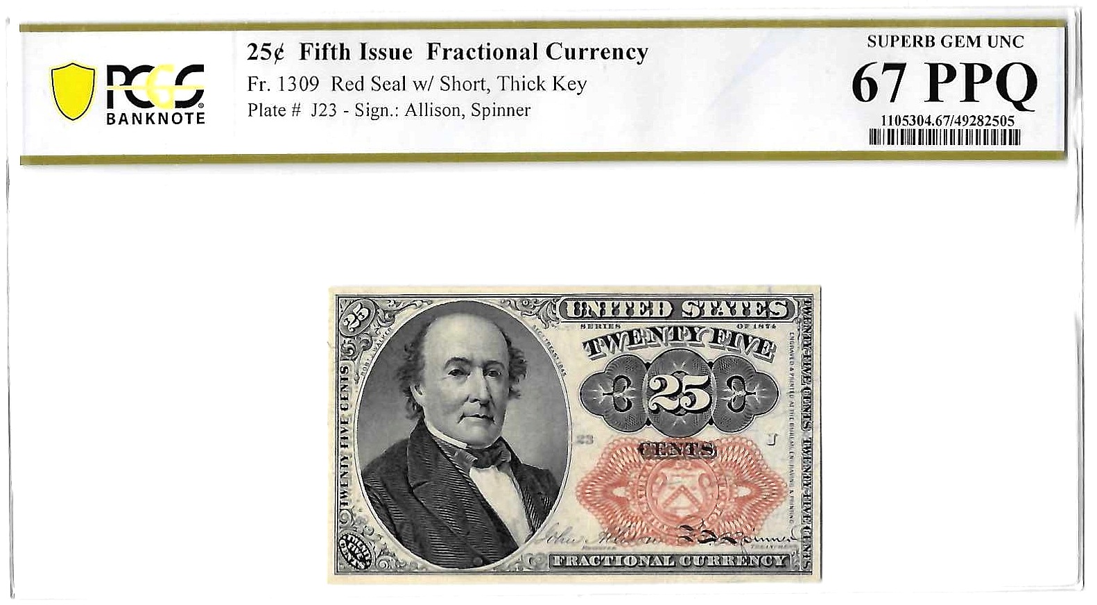 25 Cent 5th Issue Fractional Currency Fr-1309 PCGS Superb Gem CU-67 PPQ