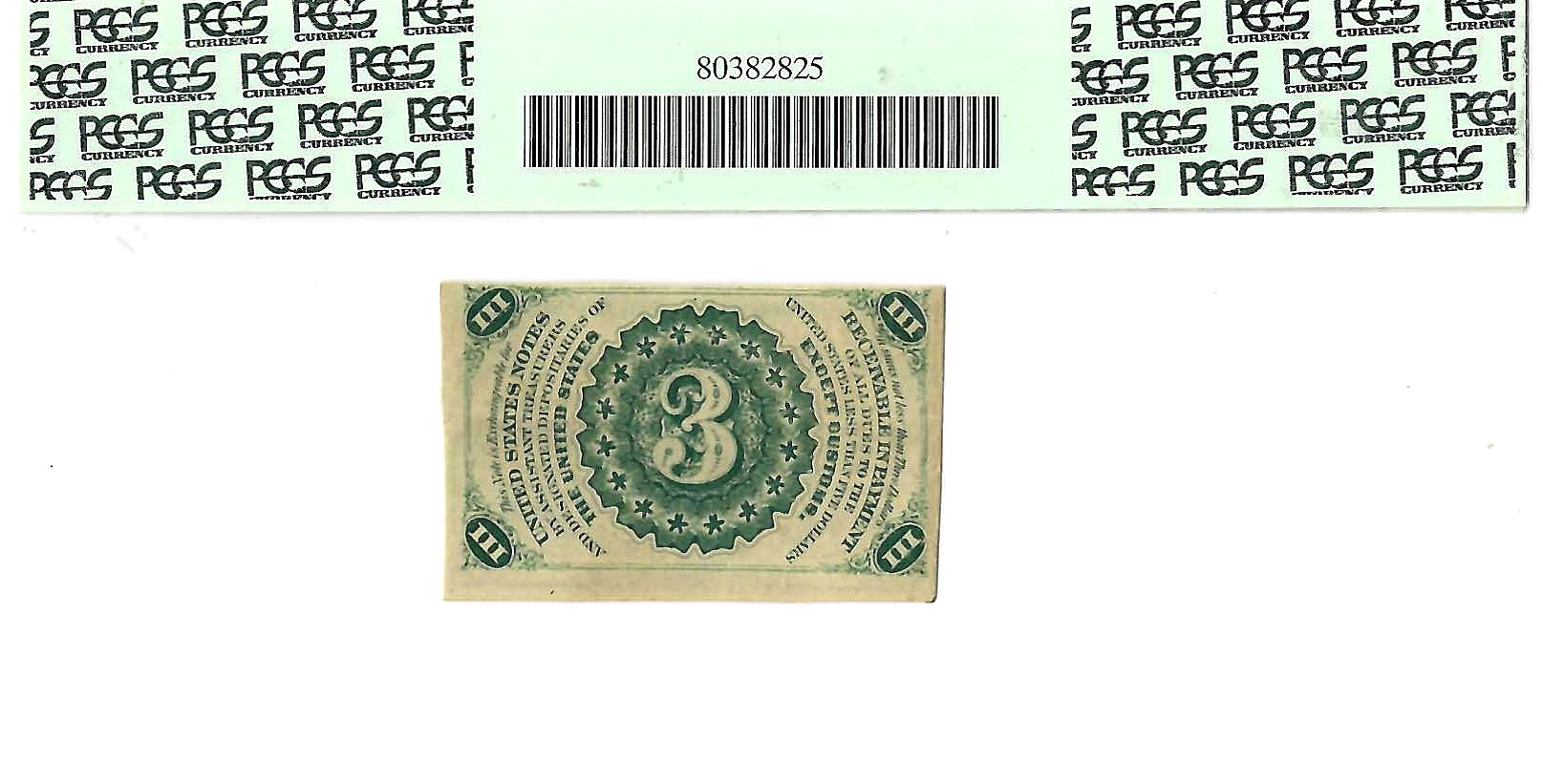 The 3-cent Third Issue Fractional Currency note, featuring a portrait of George Washington and was issued between 1864 and 1869. These “paper coins” featured light (Fr. 1226) or dark (Fr. 1227) backgrounds behind Washington’s head, and were the only 3 Cent denominational pieces printed during the entire life span of Fractional Currency. This is the tougher of the two with a dark background.