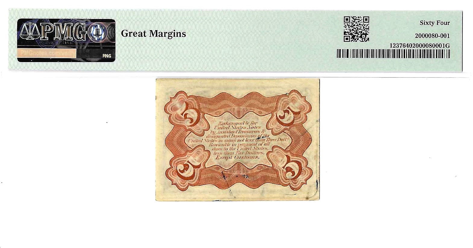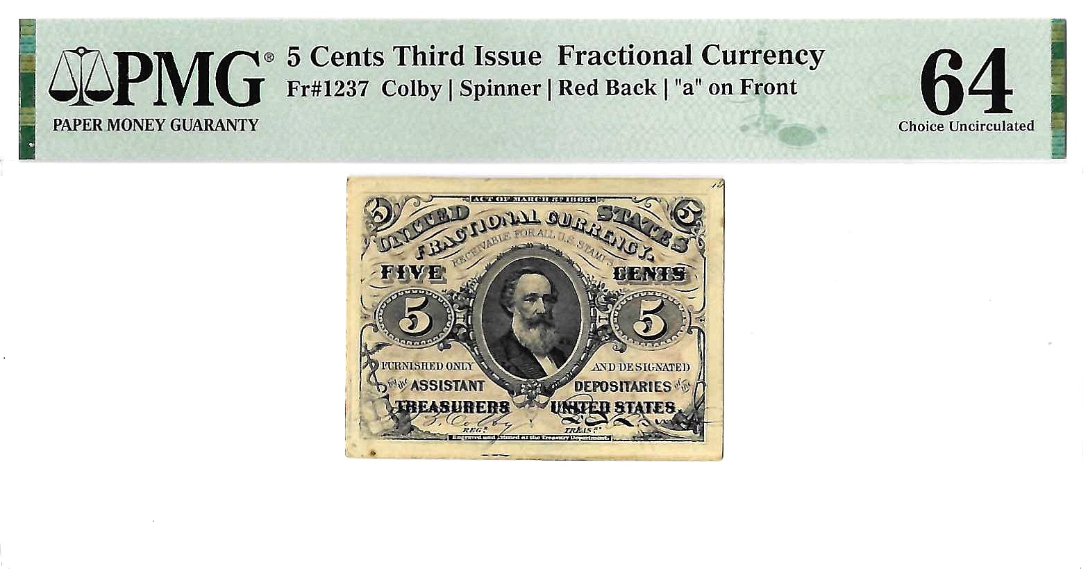 “Red Back”. Design Letter “a”. This note features the bust of Spencer M. Clark, first Superintendent of the National Currency Bureau. It caused a scandal because Clark placed his own portrait on the currency, leading to a law forbidding living people on U.S. currency. This is the scarcer red reverse varity with quality color, the great margins are noted.
