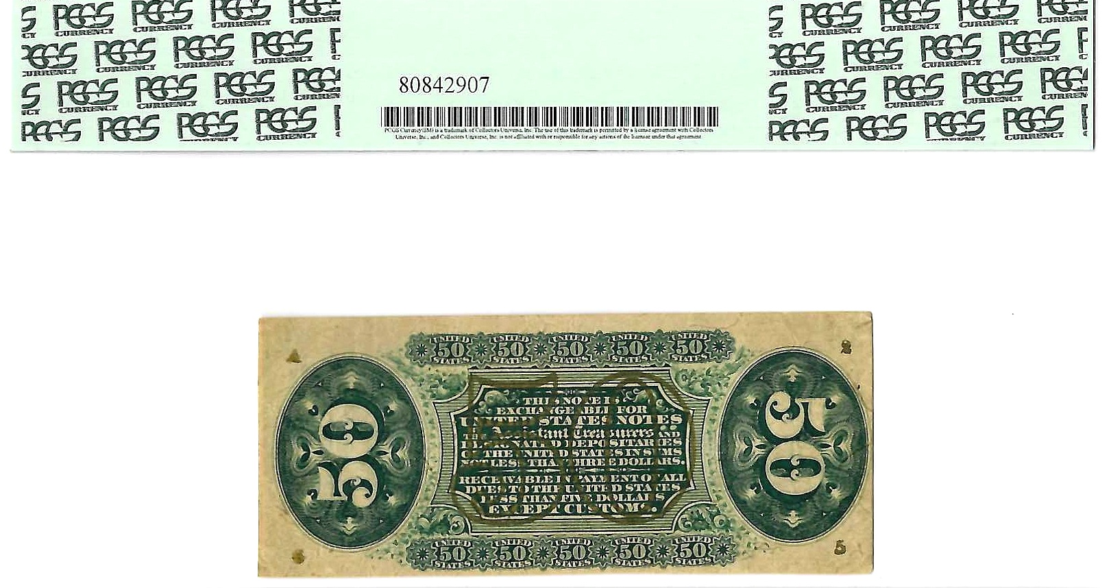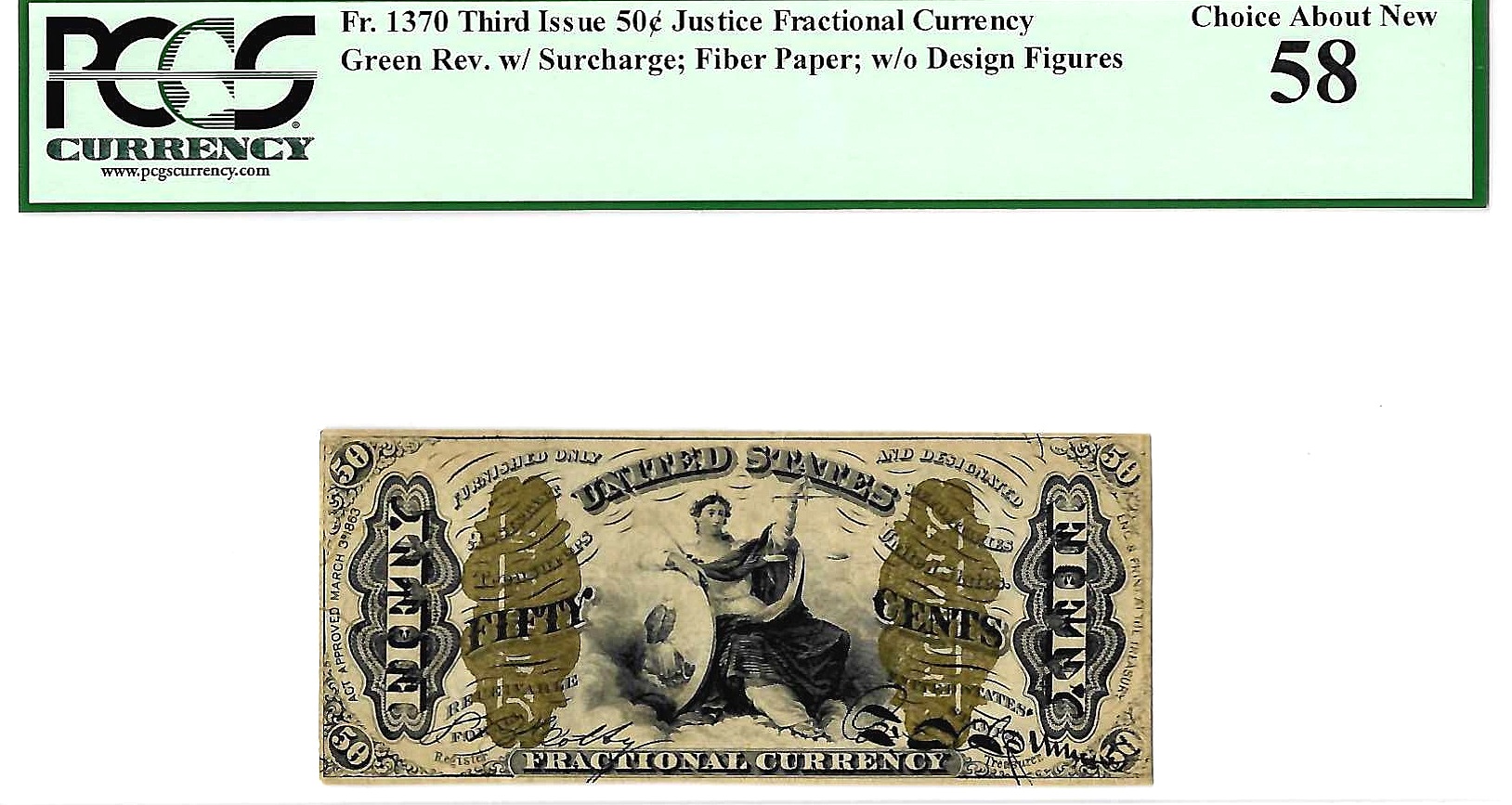 Green Reverse with Surcharge. Fiber Paper. w/o Design Figures. A nearly new note with strong color and nice bronzing.