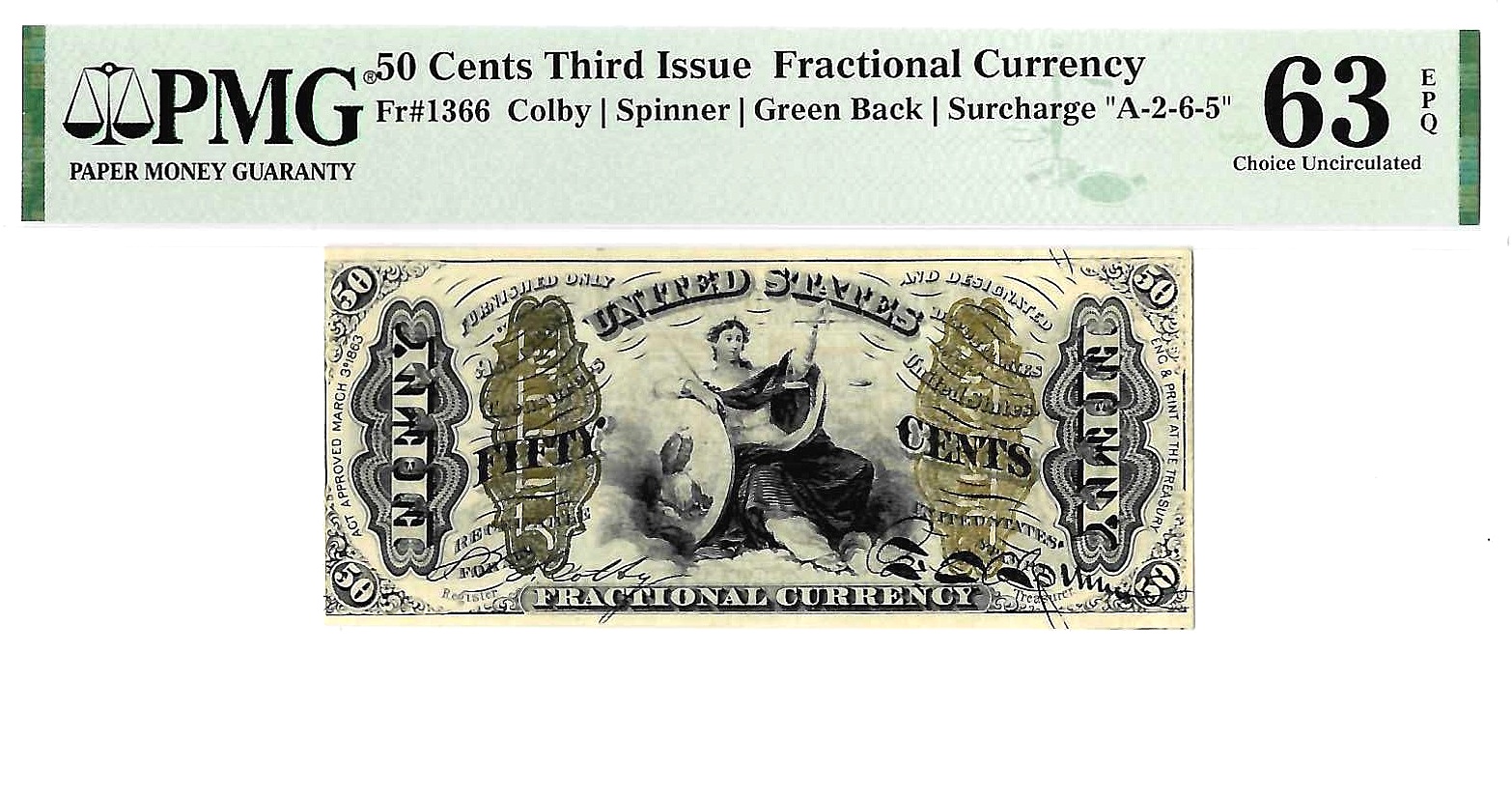 Green Back. Surcharge “A-2-6-5”. Justice seated with shield, sword, and scale. A scarce issue in this grade, with only 5 graded 63 EPQ and 7 finer by PMG. Vibrant bronzing on both the obverse and reverse with bold surcharges.