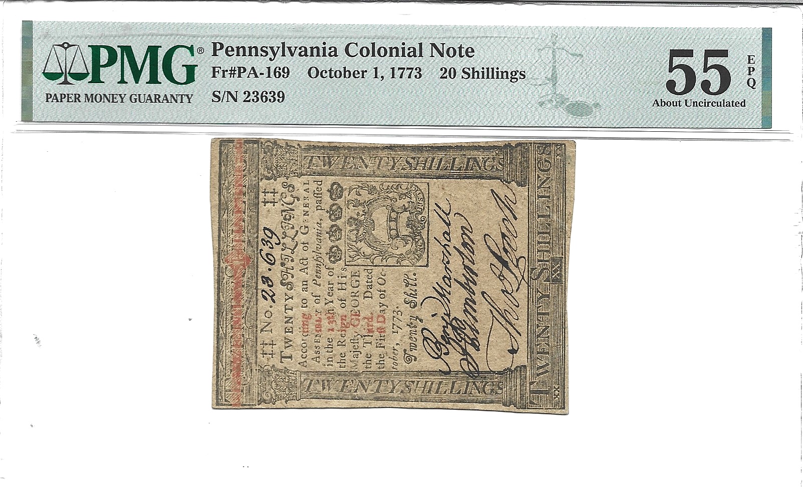 Nicely margined with bold signatures. The paper is premium and displays minimal wear. A touch of red ink amongst the black color adds to an already strong eye appeal.
